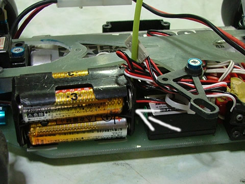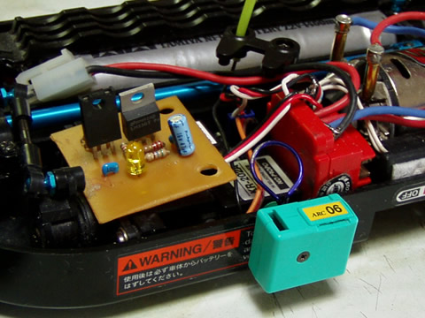 バッテリーから直接5Vを取る事に。 適当な基盤を利用して、3端子レギュレーターをバッテリー電源と受信機電源の間に入れています。 2コ付いてますが、片方しか使用していません。 これでノーコンの心配も減りました。 もちろんメーカー保証外ですが… もしアンプが壊れてしまったら自分で直してみるのも安上がりですよ。 |